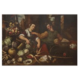 Attribuiti alla bottega cremonese di Vincenzo Campi nella raccolta di provenienza, i dipinti qui presentati devono essere piuttosto ricondotti a quella di Joachim Bueckelaer (circa 1530-circa 1570) attivo ad Anversa nel terzo quarto del Cinquecento o, più verosimilmente, all’attività di un suo seguace immediato.