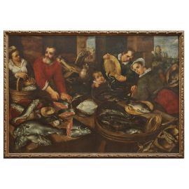 Sono infatti numerosi, soprattutto in quest’ultima, i motivi di confronto iconografici e compositivi con le opere documentate del pittore fiammingo, in particolare con le tele ora nel Museo di Capodimonte, dalla collezione Farnese: si veda a questo proposito il Mercato del pesce (inv. Q 163) simile al nostro anche per dimensioni, siglato e datato del 1570, che ne anticipa la scansione in due parti caratterizzate, rispettivamente, dal tavolo ingombro di salmoni interi e a tranci, e da un barile pieno d’acqua alla cui superficie galleggiano pesci di specie diverse.
