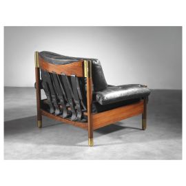 «SELLA» ARMCHAIR AND FOOTREST, WOODEN STRUCTURE, BLACK LEATHER UPHOLSTERY