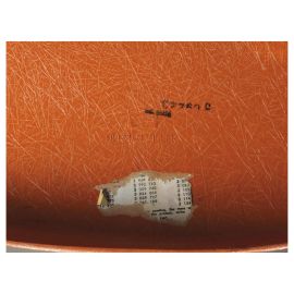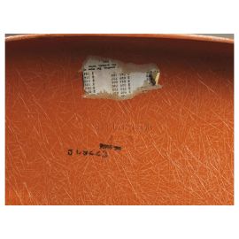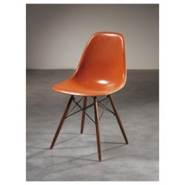 FOUR «EAMES FIBERGLASS SIDE CHAIR» CHAIRS, ORANGE PLASTIC MATERIAL, WOOD AND METAL LEGS