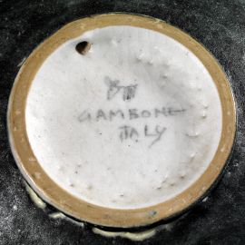in ceramica con decoro astratto nei toni del rosso, azzurro e nero