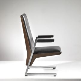 SIX ARMCHAIRS, WOODEN AND CHROMED METAL STRUCUTRE, BLACK LEATHER UPHOLSTERY