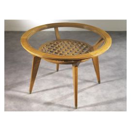 WOODEN TABLE, GLASS TOP, BRASS FEET