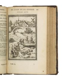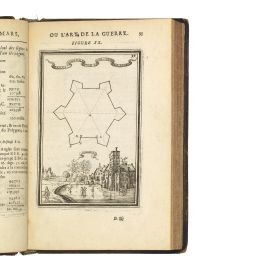 SECONDA EDIZIONE IN LEGATURA COEVA di questa opera profusamente illustrata che descrive l’arte militare da ogni punto di vista: il primo volume affronta nel dettaglio la progettazione e costruzione di fortificazioni regolari e irregolari; il secondo propone un riassunto dei metodi di fortificazione ideati da vari autori e fornisce delucidazioni in merito agli strumenti e materiali impiegati nell’architettura bellica; il terzo dedica i primi sette capitoli alla struttura gerarchica militare illustrandone i vari gradi, le varie componenti e le rispettive mansioni, e i successivi capitoli all’artiglieria (in particolari ai cannoni), agli strumenti e tattiche d’attacco e difesa, agli assedi. Il sesto e ultimo libro del terzo volume è interamente dedicato alle milizie turche e alla loro arte militare. Il trattato è corredato da una dovizia di tavole finemente incise che spesso hanno nella parte superiore piante e sezioni di fortificazioni, nella parte inferiore deliziosi paesaggi talora con scenette animate (danze, pattinaggio sul ghiaccio, pesca, schermidori ecc.) e vedutine di città (Parigi, La Rochelle, Barcellona, la Tour de Belen a Lisbona, Napoli, Madrid, Venezia, l’Escurial, Amsterdam, Lione, ecc.). Altre tavole illustrano costumi, schieramenti di battaglia, armi, armature, parate, cannoni e fabbricazione di polvere da sparo, trincee, accampamenti, città e costumi turchi.
