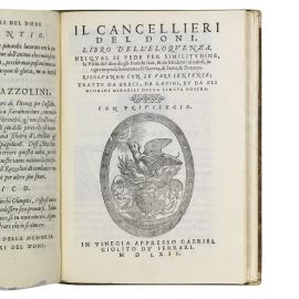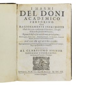PRIMA EDIZIONE del Libro dell’eloquenza, rilegato con i famosi Marmi e con il Libro della memoria. Sono tutte opere di dialoghi bizzarri. Nei Marmi, il Doni finge di essere stato tramutato in un uccello, libero di volare e di ascoltare le conversazioni di chi si raduna, per chiacchierare, sui “marmi”, le scalinate in marmo del Duomo di Firenze. Include una dissertazione sull’ignoranza presso gli antichi (con immagine di antico romano con orecchie d’asino), due pazzi che discorrono d’astrologia, un discorso sui titoli dei libri “i quali se non sono curiosi, non hanno esito”, uno scambio di idee su una “moglie fastidiosa, e superba, la quale pretendea superiorità con l’huomo”, motti e burle, scambi di idee su traduttori e compositori dei libri, la burla del pesce marinato e dei maccheroni, disquisizioni contro gli uomini effeminati, sulla chiromanzia, fisionomia, ecc. Il libro della Memoria è una raccolta di aneddoti relativi agli antichi e ai moderni (incluso uno su Dante), mentre il libro dell’Eloquenza affronta una grande varietà di argomenti, incluso il “Fine del leggere”: “I buoni libri non sono scritti per passare il tempo leggendogli, né si debbono usare per istratiare il tempo; ma per gouernarsi nelle fortune felici et infelici a tempo. Leggere et intendere è da huomo, leggere et non intendere è da animale.”