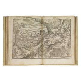 SECONDA EDIZIONE, AMPLIATA E PIÙ RARA sul mercato rispetto alla prima pubblicata per la prima volta da Bevilacqua nel 1585, di questo importante trattato rinascimentale di arte militare dedicato a Carlo Emanuele I. Proprio a fianco di Carlo Emanuele, Busca portò a termine lavori di fortificazione quali la cittadella di Bourg-en-Bresse, il forte di S. Francesco, i forti della Consolata a Demonte e di Santa Maria a Susa, rafforzando lo stato sabaudo e potenziandone l’organizzazione difensiva. Rientrato a Milano nel 1599, venne nominato “architetto regio e ducale dello Stato” e poté sovrintendere a diversi importanti progetti, tra cui la costruzione del Forte di Fuentes. Le undici spettacolari tavole a doppia pagina raffigurano paesaggi rinascimentali con costruzioni o formazioni belliche, con metodi di misurazione, o con poderosi attacchi (in uno si assiste anche alla deflagrazione di un forte con tutti i soldati che saltano per aria).