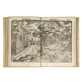 In 4to (243 x 170 mm), in due parti, ciascuna con proprio frontespizio, marca tipografica incisa in legno, testate e grandi capilettera ornati o parlanti incisi in legno, 11 tavole xilografiche montate su brachette (di cui 9 fuori testo e 2 incluse nella segnatura), diagrammi e vignette nel testo dell’Instruttione (carte un po’ ingiallite, sporadiche fioriture marginali, minimo difetto della carta a F1 con piccola perdita, risarcito l’angolo inferiore esterno di Y4 senza perdite). Pergamena flessibile moderna in stile, titolo manoscritto al dorso.