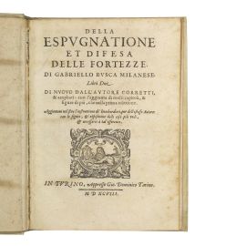 (Fortificazioni) BUSCA, Gabriele. Della espugnatione et difesa delle fortezze libri due. Aggiontovi nel fine l’Instruttione de’ bombardieri. In Turino, Gio. Dominico Tarino, 1598.