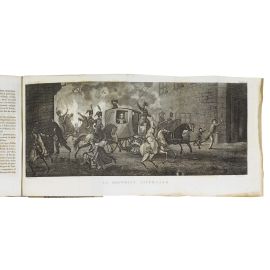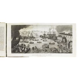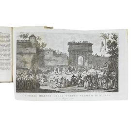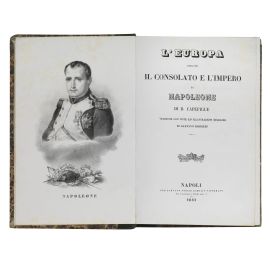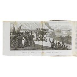 2 volumi in 4to (218 x 138 mm) in 4 parti. Vol. 1: [ii] xxvii 478 pp. e [16] tavole calcografiche (di cui 8 ripiegate); [iv] 466 pp. e [16] tavole (di cui 8 ripiegate). Vol. 2: [iv] 447 [1] pp. e [18] tavole (di cui 8 ripiegate); [iv] 487 [5] pp. e [17] tavole (di cui 7 ripiegate). Totale: 66 (di 79) tavole. Mezza pergamena coeva, dorso liscio con doppio tassello ed eleganti decorazioni dorate, tagli spruzzati di rosso. -- Mancano 13 tavole, fioriture occasionali, tavole occasionalmente gualcite o con qualche strappo. [CON:] Capefigue, Jean Baptiste Honoré Raymond. L’Europa durante il consolato e l’impero di Napoleone. Napoli, per Gaetano Nobile, 1841-1846. 3 volumi in 4to, ritratto calcografico in antiporta a ciascun volume, testo non collazionato, mezzo marocchino verde coevo, dorsi lisci elegantemente decorati in oro, tagli spruzzati d’azzurro.