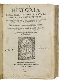 PRIMA EDIZIONE IN ITALIANO ILLUSTRATA. Seconda traduzione italiana dell’opera di Magnus sulla Scandinavia dopo l’edizione veneziana di Francesco Bindoni del 1561 nella versione di Remigio Fiorentino, che però non era illustrata. Lo splendido e ricco repertorio iconografico, costituita da oltre 400 vignette xilografiche, è tratto dalla prima edizione pubblicata in Italia, a Roma, nel 1555, in latino, con la differenza che nella presente edizione la mappa è incisa su rame anziché su legno. Considerata un importantissimo testo di riferimento relativo alla storia naturale, alla cultura, ai costumi e alle pratiche militari scandinave nella seconda metà del Cinquecento, l’Historia delle genti illustra i più vari aspetti della vita di quelle popolazioni: clima (inclusi freddo intenso e suoi effetti, castelli di neve, gestione del ghiaccio), orologi, luoghi soprannaturali, pigmei; nel libro terzo, intitolato “De la superstiziosa cultura de li Demonii, de’ popoli Aquilonari”, sono presentati culti, arti magiche, strumenti magici, maghi marini, ecc.; nel libro quarto, intitolato “De le guerre, e de’ costumi de’ Pagani selvaggi, e de’ vicini”, sono illustrate le caccie dei Lapponi (c. 53v); il quinto libro concerne i “Giganti” e le loro storie, ma anche le donne guerriere; il sesto libro tratta miniere, metalli, monete, orefici, pellicce; il settimo è dedicato agli strumenti di guerra, l’ottavo a governanti, magistrati e esercizio militare, il nono alle guerre campestri, il decimo a quelle navali e al nuoto, l’undicesimo alle guerre su ghiaccio, il dodicesimo all’architettura civile (con paragrafi su alberi e resina), il tredicesimo all’agricoltura (inclusi paragrafi su pane, vino - c. 159 - idromele, ecc.), il quattordicesimo ad abiti, nozze, adulteri ecc., il quindicesimo all’esercizio fisico, alle feste, ai giochi (dadi e scacchi - c. 181), scherma, balli, musica; il sedicesimo parla delle istituzioni ecclesiastiche, di funerali e sepolture, medicina, il diciassettesimo degli animali domestici (cani, cavalli, renne), il diciottesimo degli animali selvatici (alci, lupi, cervi, daini, castori, lepri, linci, lontre, martore, zibellini, ermellini, tassi, orsi, volpi) e della loro caccia (c. 226v), il diciannovesimo degli uccelli (incluso un paragrafo su come curare i falconi e gli altri uccelli da caccia - c. 238 - e uno sulla caccia alle perdici - c. 244v), il ventesimo tratta i pesci e la pesca (inclusi paragrafi sui pesci affumicati e sotto sale), il ventunesimo affronta i pesci mostruosi (orche, balene, pesci alati, polpi ecc.) il ventiduesimo gli insetti (inclusi paragrafi di apicoltura e coltivazione delle perle). La bellissima mappa mostra Svezia, Norvegia, Danimarca e parte di Finlandia.