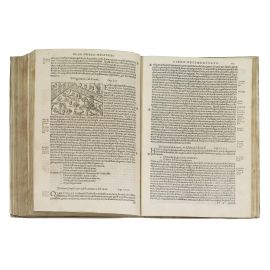 In folio (290 x 210 mm). [xxvi] 286 carte. Un’incisione calcografica a piena pagina e oltre 450 vignette xilografiche nel testo. Pergamena rigida antica, dorso rifatto. Antiche firme d’appartenenza al frontespizio. -- Assente la sguardia volante all’inizio, minimo lavoro di tarlo al margine inferiore delle prime due carte, strappetto parzialmente restaurato ad A1, strappetto ad H2, trascurabile lavoro di tarlo al margine interno delle carte I4-K5, strappo parzialmente restaurato alla carta K4 (76), strappo con minima perdita al margine esterno della carta L8 (88), qualche carta ingiallita, qualche pallida macchia, ma nel complesso buona copia fresca e genuina.