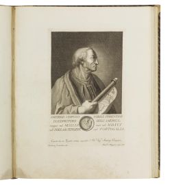 ONE OF THE MOST FAMOUS WORKS PRODUCED BY FLORENTINE PUBLISHING IN THE SECOND HALF OF THE EIGHTEENTH CENTURY, CONTAINING 202 BIOGRAPHS OF ILLUSTRIOUS TOSCANS PORTRAITS BY ZOCCHI and others, decorated with splendid engraved vignettes (headers with views of Florence, figured initials, large illustrated tailpieces), printed on strong, white paper. Lacks one portrait and other defects. Together with a SERIES OF REFINED ALLEGORICAL PLATES IN PURE NEOCLASSICAL STYLE. Detailed description, condition report and additional images upon request.