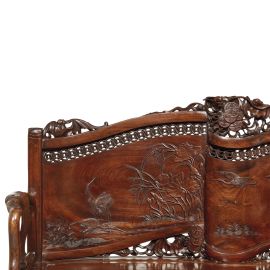 composto da divano, due sedie e un tavolino in legno rosso, lavorato con pipistrelli, monete, volatili e fior di loto, reca marchio e scritta.