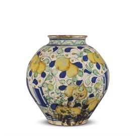 in maiolica dipinta a policromia in blu, giallo, giallo arancio e verde ramina; alt. cm 32, diam. bocca cm 15,2, diam. piede cm 15