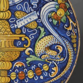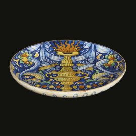 La coppa presenta cavetto concavo con tesa alta e terminante in orlo sottile e arrotondato, mentre la larga tesa è appena inclinata e poggia su un alto piede a orlo estroflesso. Il decoro policromo, che ricopre l’intera superficie, si basa su un motivo a grottesche che si sviluppa in una candelabra centrale con base a mascherone e terminante in un braciere ardente, affiancata nella parte mediana da due draghi simmetrici contrapposti, dalle cui fauci escono due cornucopie sinuose ricolme di frutta e una catenella con perle bicolore. Intorno, a completare la decorazione, alcuni trofei e un tendaggio. Tra i trofei in alto entro un cartiglio si legge in caratteri corsivi ano domini/ 1532. Al verso un orlo definito da sottili archetti blu e una marca a P paraffata.