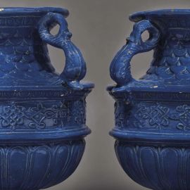 Fu Andrea della Robbia, scultore versatile e intraprendente, nipote del celebre Luca dal quale aveva ereditato il “segreto” della scultura invetriata, ad avviare verso il 1490 una tale fortunata produzione di raffinati vasi ornamentali ‘all’antica’, traducendo in opere autonome tridimensionali le coppe che da qualche tempo venivano modellate a rilievo nelle cornici delle ancone robbiane come sorgivo supporto dei caratteristici festoni vegetali, smaltate a simulare il marmo o le pietre dure (lapislazzuli e porfido, perlopiù alternati). In seguito tra i numerosi figli di Andrea attivi nella bottega robbiana è proprio Giovanni, incline a un’esuberante vena decorativa nutrita dal repertorio archeologico in voga nel primo Cinquecento, il principale responsabile di una consistente produzione di vasi invetriati, raggruppabili per forma e ornato in quattro tipologie, ovoidi o ad anfora, di complessità crescente, perlopiù replicate con l’ausilio di calchi, ma spesso introducendo alcune varianti nell’ornato.