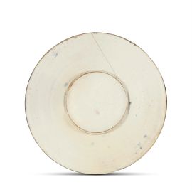 in maiolica dipinta in policromia in verde, blu di cobalto, bruno, bistro. Reca sul fronte entro due cartigli separati la sigla P.B. e la data 1532; diam. cm 23,1, diam. base cm 10, alt. cm 3