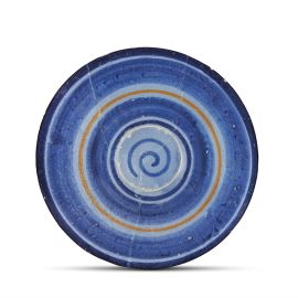 maiolica dipinta in policromia su fondo berettino azzurro; diam. cm 24,8, diam. piede cm 7, alt. cm 3