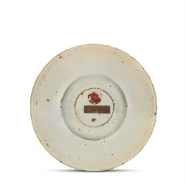in maiolica dipinta in policromia con verde rame, verde oliva, giallo, giallo arancio, blu di cobalto, bruno di manganese nella tonalità del nero e del marrone. Sul retro etichetta di collezione EDWARD HAILSTONE/ WALTON HALL e parte di sigillo in ceralacca rossa; diam. cm 26,4, diam. piede cm 7,8, alt. cm 3,5