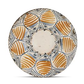 in maiolica dipinta in policromia blu di cobalto, giallo, giallo arancio e bianco di stagno; diam. cm 24,2, diam. piede cm 8,8, alt. cm 12,6