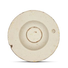 in maiolica dipinta in policromia con giallo ocra, bruno di manganese, blu di cobalto e tocchi di rosso ferraccia. Datato 1550 entro un cartiglio; diam. cm 22,6, diam. piede cm 10, alt. cm 6,7