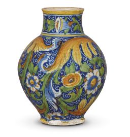in maiolica dipinta a policromia in blu, giallo, giallo arancio, verde ramina e bianco di stagno, manganese; alt. cm 30, diam. bocca cm 11, diam. piede cm 12
