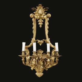in bronzo dorato, apice formato da elemento floreale, terminante in piccolo elemento a pigna. Due volute che scendono ad avvolgere elemento centrale lavorato a giorno e decorato con elementi fogliacei dal quale si dipartono radialmente quattro bracci; in stile settecentesco; montato ad elettricità; cm 70x40