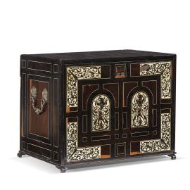 in legno ebanizzato ed intarsiato, calatoia decorata con riserve e profilature in osso con motivi a girali sugli angoli, e scene mitologiche di lotta sul fronte, il retro della calatoia decorato a grottesche e volute ed impreziosito da stemmi; aprendola rivela vano centrale analogamente decoarato e contornato da sette cassettini apribili e sotteso da un cassettino più lungo; il vano centrale cela ulteriori due cassetti con tiretti fatti di spago; maniglie laterali in bronzo cesellato per il trasporto; completo di chiavi; cm 43,5x54x36, con maniglie aperte cm 43,5x68x36