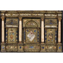 in legno scolpito ebanizzato e dipinto in oro, di forma architettonica, presenta quattro colonne sul fronte che scandiscono tre edicole decorati con pietre dure di varie forme e geometriche e dimensioni, ed i cui elementi compositivi sono estraibili tramite piccoli tiretti circolari o elementi architettonici, come per la base la quale si estrae come unico vano; il grande timpano spezzato e gli elementi ad esso adiacenti sono fissi in quanto facenti parte di vano rivelabile alzando il piano superiore dello stipo; poggia su quattro elementi angolari in foggia di leone; le maniglie sono mancanti; cm 45x59x36