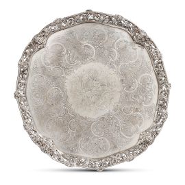 in argento, il piano interamente cesellato a girali e motivi floreali che circondano stemma nobiliare entro cartouche e mazzi di fiori, orlo riccamente cesellato a traforo con decori a tralci di vite e grappoli d’uva intervallati da piccole riserve e volti di Bacco, in corrispondenza dei quali scendono piedi a voluta analogamente lavorati; diam. cm 52x5,9