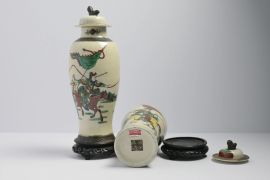 Pair of small poticas with cream-colored Chinese ceramic lids painted in polychrome with warriors on horseback, taken in the form of Buddhist lions, late 19th / early 20th century, h 27 cm, damages, complete with perforated wooden bases, bearing the inscription label "Fontanelle Galleria Corso Vercelli 23 Milano".
