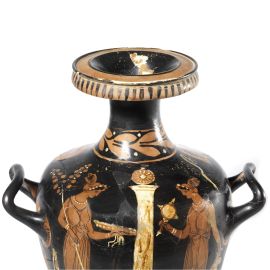 La decorazione figurata sul corpo è delimitata inferiormente da meandro interrotto da riquadri a croce e punti negli angoli. Lato A: due donne affrontate, a capo chino, adorne di gioielli e con acconciatura raccolta nel sakkos; una tiene nelle mani uno specchio e un tralcio di vite, l’altra una phiale e il bastone di ferula (narthex), attributo frequentemente attestato per le figure di menadi; tra di loro è un pilastro. Lato B: grande pametta aperta eretta tra motivi fitomorfi stilizzati.