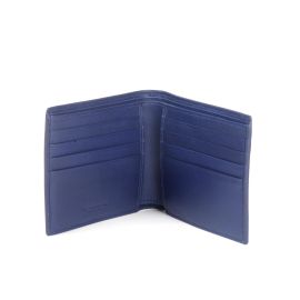 L’intreccio della morbidissima pelle blu caratterizza questo portafoglio con 8 spazi per carte di credito e doppio spazio centrale per soldi.