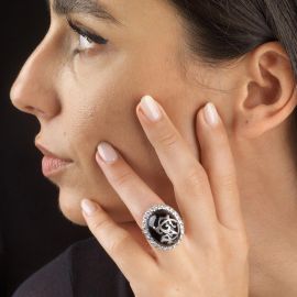 in oro bianco 18kt, composto da una pietra in onice cinta da una fila di diamanti taglio brillante per ct 1.20 circa, sormontato da un monogramma in metallo, mis. 45, gr. 15