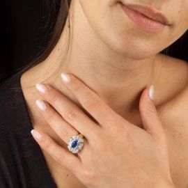 in oro giallo e bianco 18kt, al centro uno zaffiro taglio ovale di ct 1.80 circa cinto da petali impreziositi da diamanti taglio brillante per ct 0.80 circa, mis. 54, gr. 11