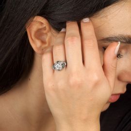 in platino, al centro un diamante taglio brillante di ct 0.60 circa, circondato da un motivo floreale impreziosito da intarsi in smeraldo e onice (due mandanti), con pavé di diamanti taglio brillante e huit huit (due mancanti) per ct 1 circa, punzone PT, mis. 54, gr. 4