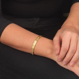 in oro giallo 18kt, composto da una serie di maglie con un fregio decorativo inciso, impreziosito da pietre rosse taglio fantasia, punzone 18kt, lungh. cm 18,5, gr. 13