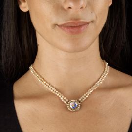 composta da un doppio filo di perle leggermente digradanti di mm 3-2 circa, con elemento centrale in oro a basso titolo recante una miniatura in smalto raffigurante un soggetto religioso, fermatura in oro bianco 18kt impreziosita da zaffiri e diamanti taglio rotondo per ct 0.30 circa, punzone 750, lungh. cm 38, gr. 18