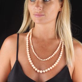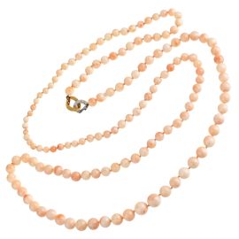 composta da un filo di sfere in corallo rosa digradanti di mm 12-6 circa, fermatura in oro giallo e bianco 18kt firmata "Pomellato", punzoni 750 e del fabbricante, lungh. cm 137, gr. 144