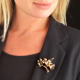 in oro giallo e bianco 18kt, raffigurante un uccello poggiante su un ramo impreziosito da perle di mm 4 circa, un rubino taglio rotondo e diamanti taglio huit huit per ct 0.10 circa, dim. cm 3,5x5, gr. 10