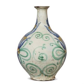 in maiolica decorata in policromia con blu di cobalto, verde ramina, giallo antimonio e rosso ferraccia; alt. cm 41, diam. bocca cm 8,5, diam. piede cm 14,4