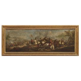Simili per dimensioni alla coppia di battaglie a Roma nella collezione Pallavicini, le tele qui presentate possono accostarsi, per qualità oltre che per formato, alla coppia (Scontro di cavalieri; Dopo la battaglia) nelle Gallerie fiorentine, dalla collezione Feroni, riferite a “Monsù Leandro” da un cartellino di collezione al retro (M. Chiarini, Battaglie. Catalogo della mostra, Firenze 1989, p. 92, nn. 33-34).