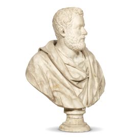 Questo busto panneggiato, avvolto in un'ampia tunica secondo il costume in uso nella Roma antica, deve ritenersi un prodotto della Firenze di fine Cinquecento, al più degli inizi del secolo successivo. Non è nota l'identità dell'effigiato, nulla nell'abbigliamento fornisce dettagli al riguardo, e non è ugualmente conosciuto il contesto di provenienza, ovvero il palazzo o il complesso funerario in cui era esposto. Al di là di una leggera consunzione superficiale e di alcune limitate fratture, l'opera si presenta in ottimo stato.