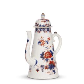 La caffettiera alta, talvolta definita “a forma di faro”, prende ispirazione dai vasi inglesi d'argento realizzati tra il 1680 e il 1740 e inviati in Cina come modello, anche se il beccuccio a forma sinuosa sembra trarre spunto da forme medio orientali come pure l’ansa molto semplificata; il coperchio a cupola è sormontato da una presa a pomolo. Le caffettiere di questo modello furono prodotte in Cina fino al 1800 circa. Il decoro è dipinto in blu sottosmalto e smaltato in ferro rosso e oro, sovracoperta, con rami di peonia tra foglie e fioretti minori che spuntano tra foglie di varia forma, secondo uno schema tratto dai modi stilistici della porcellana Imari. Lungo il bordo il motivo si ripete più fitto a guisa di corona e il coperchio a cupola è decorata en suite; un decoro con un rametto a piccole foglie e con rametto con piccoli tratti sottili rossi decora infine il cannello.