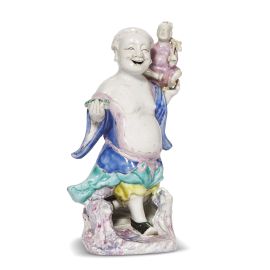 Il gruppo in porcellana bianca dura, decorata con smalti (fencai) della palette della famiglia rosa, raffigura una variante insolita del gruppo dei cosiddetti gemelli immortali Hé Hé Er Xian, qui nella versione cosiddetta “piggy back”, nel significato del trasporto di una persona sulle spalle, con uno dei due personaggi con una rana in mano che sorregge l’altro in veste di piccola bambina con un fior di loto in mano.
