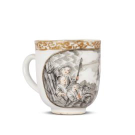 La tazzina a campana, con ansa ad anello, poggia su un piede poco rilevato. Il decoro in oro interessa la fascia attorno all’orlo, mentre al centro della composizione, entro un medaglione circolare, si scorge una scena di concerto con quattro figure nello stile di Watteau: sulla sinistra un musicista seduto sotto un albero, dietro di lui un personaggio seduto e una signora con cappellino, al centro una figura femminile stante rivolta all’esterno, sulla destra un paesaggio in seppia e bistro. La scenetta con musicisti in ambito agreste è spesso utilizzata e richiesta da parte della committenza occidentale. Una variante, con una figura femminile subito dietro al musicista, intitolata “la Dance” e dipinta in policromia, si trova su una caffettiera formalmente nella collezione E. Vandekar a Londra.