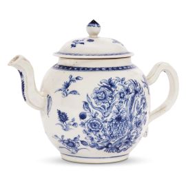 La teiera ha corpo globulare su base piana, presenta un beccuccio a sezione poligonale dalla forma sinuosa e un’ansa anch’essa poligonale con andamento arcuato ad orecchio; il coperchio, sorretto da un basso collo cilindrico, è a cupola e mostra un pomolo appuntito. Il decoro è a monocromia blu sotto smalto e si sviluppa sulle due facce della teiera con una raffigurazione floreale affine al cosiddetto decoro Fitzhungh pattern, che deriva il suo nome da Thomas Fitzhungh attivo a Canton dal 1786 al 1800 come direttore della Compagnia britannica delle Indie orientali. Il decoro, che si basa su un gruppo di fiori di chiara ispirazione orientale, è spesso associato a diverse tipologie di bordure e si presenta in diversi colori, tra cui il blu e il bianco sotto smalto sono i più comuni. La porcellana Fitzhugh era particolarmente popolare in Nord America, e gli ufficiali dell'EIC furono autorizzati a commerciare per conto proprio e durante il periodo 1704-1790 spedirono gran parte delle opere in Inghilterra. Manca tuttavia in questa teiera la disposizione molto simmetrica, tipica del decoro sopracitato, e si desume che questo ornato sia da ritenersi intermedio tra una necessità decorativa ancora prettamente orientale e la disposizione simmetrica ben adeguata alla forma di gusto occidentale. Simile disposizione del decoro è presente in una salsiera conservata al Philadelphia Museum of Art (inv. n. 1935-13-32.13).