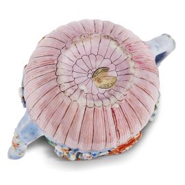In porcellana tenera, la teiera ha forma scultorea che unisce la morfologia a corpo globulare con ansa arrotondata, beccuccio rilevato e coperchio a cupola, arricchendola con elementi applicati; la base ha forma di corolla di crisantemo dipinta nei toni del rosa, mentre il corpo è fittamente decorato con vasi a tavolino a doppia parete ed elementi floreali uniti a piccoli frutti; sul coperchio un pomolo a fioretto e decori floreali a rilievo.
