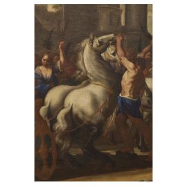 Palesemente ispirato all’antichità classica, il soggetto rimanda in ogni caso all’importante, e a Napoli relativamente inusuale, revival della storia antica che nella seconda metà degli anni Trenta ha la sua massima espressione nel ciclo di storie romane commissionate dal Vicerè spagnolo, il conte di Monterrey, per il palazzo del Buen Retiro a un gruppo di artisti tra Roma e Napoli, tra cui per l’appunto Aniello Falcone e Micco Spadaro.