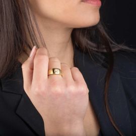 in oro giallo satinato 18kt, con diamante taglio vecchio di ct 0.30 circa, punzone 750, mis. 55, gr. 5